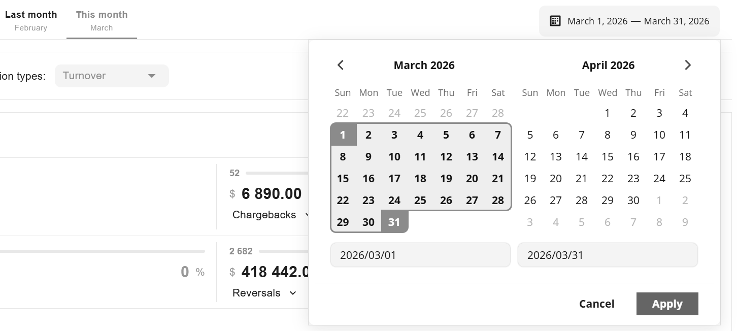 button: the ratio by volume of transactions or by amount of payments, as well as by type of transactions (sale, capture, transfer, etc). Wiserpay Payment Gateway also displays statistics on negative activity and earnings.