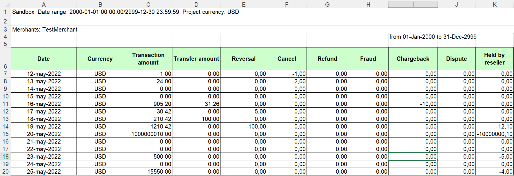 Calculates transaction turnover: sale, chargeback and amount of funds held. Shows the distribution of turnover, taking into account commissions and approximate profit for the period, as well as broken down by days.