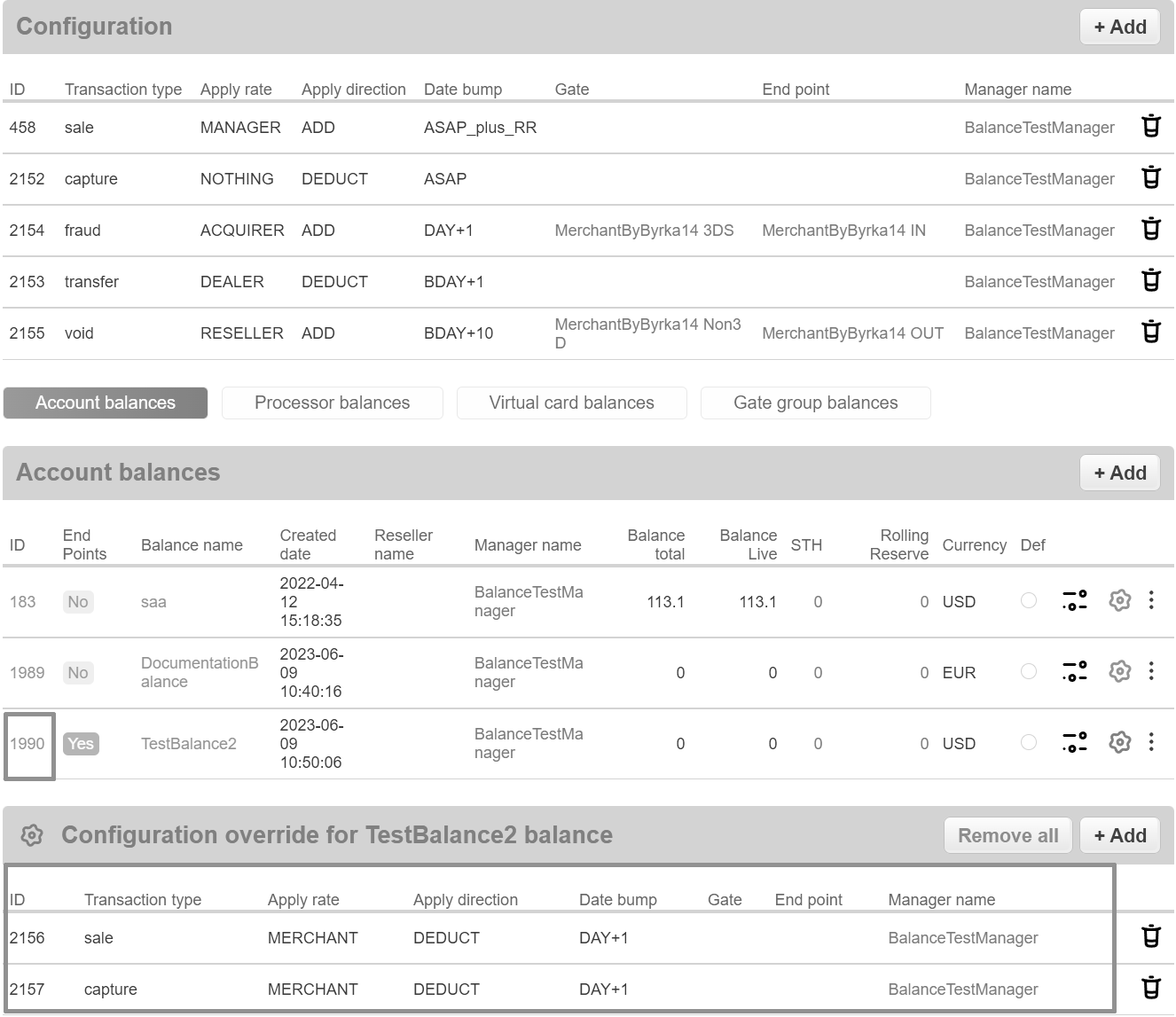 First balance is funded by sale transactions and defunded by payout transactions and is set up for USD currency, also Merchant rates applied for sale transactions. Second balance has override for sale transactions which will deduct balance with amount calculated from manager rate plan.