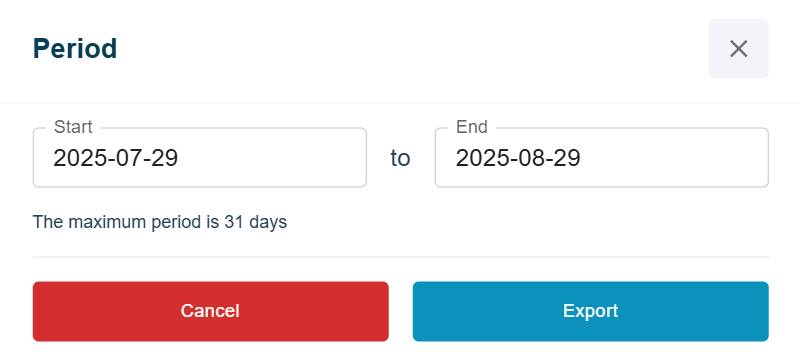 To export all adjustments for specific balance press the Export button, specify period of time and after that press Export button. The csv file of adjustments will download automatically.