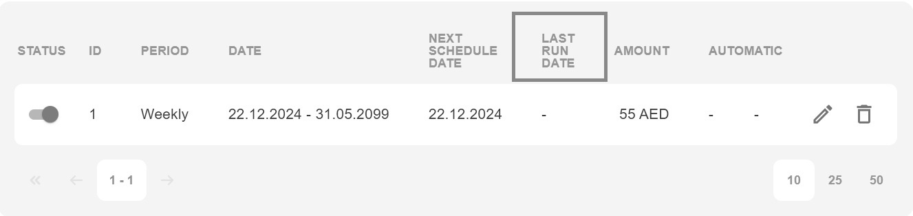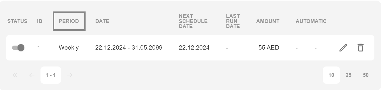 This functionality helps to configure a monthly/weekly fee, which can be set up on the appointed dates every month/week. Scheduled for balance adjustments can be made via Add+ button :