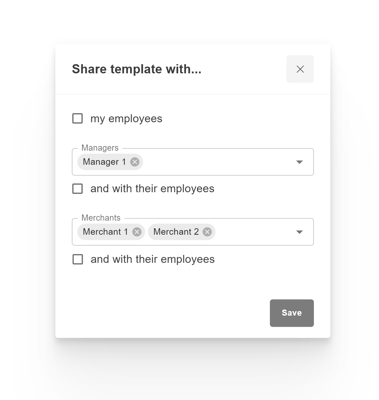 3) To edit, clone, delete or share, click three dots near the template name and select the desired parameter. The template can be shared with users at lower levels. This way, a merchant can share the template with their employees.